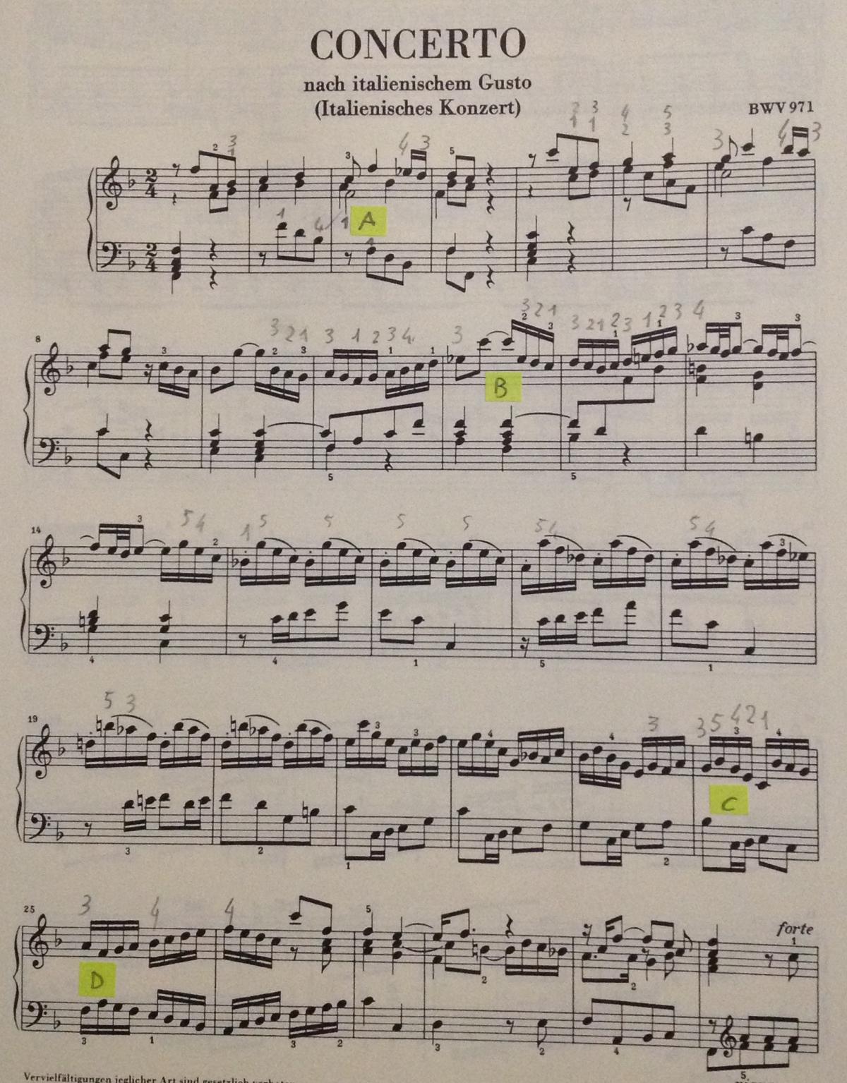 maquieto Posted February 24, 2017 Report Share Posted February 24, 2017 Allego foto visto che sto cercando di togliere il pedale dall'allemanda ed iniziando lo studio del concerto italiano. Se riesco a leggere il primo tempo per fine anno diverrà...il concerto di capodanno.. Al limite posterò qualche abbozzo di studio. Al momento mi interessa sapere se le diteggiature utilizzate sono buone o meno. Battute su cui trovo la diteggiatura un poco strana e ostica nell'allemanda sono: (la n 7 con le dita 5.4.3.5 e l'1.2.1)--------(la n 8 con il 5.3.4.2) --------(la n 9 passaggio scivolando con il pollice dal sol.b al fa). Per il concerto italiano ho messo delle tacchette removibili per facilitare la lettura. Grazie in anticipo per il consiglio. Quote Link to comment Share on other sites More sharing options...